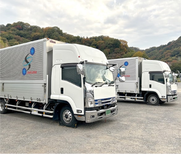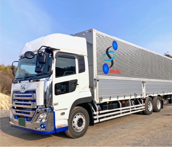 トレーラー・大型車による幹線輸送、中国5県下の小型ウイング・小型平車、ユニック車による個別配送、